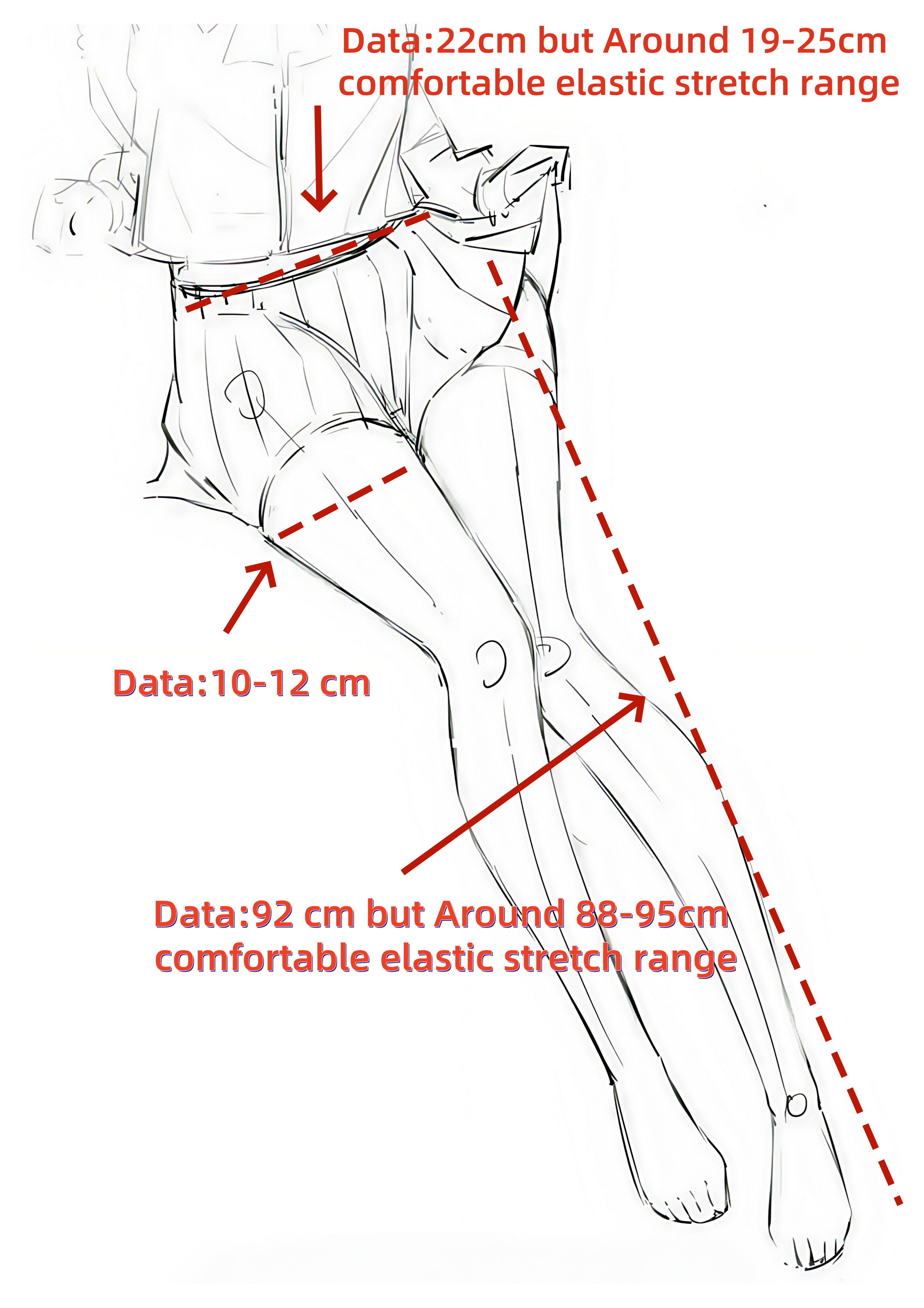 - Waist area (top red arrow): 22 cm, with a comfortable elastic stretch range of around 19-25 cm.