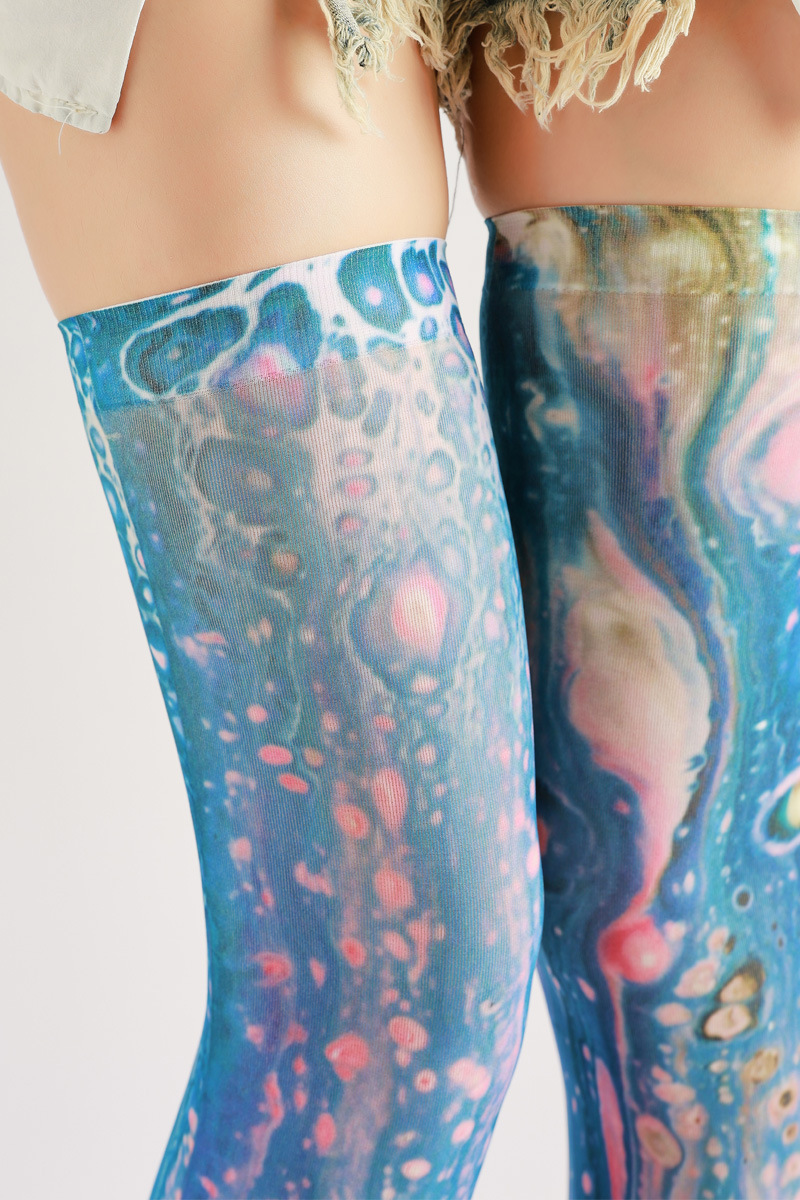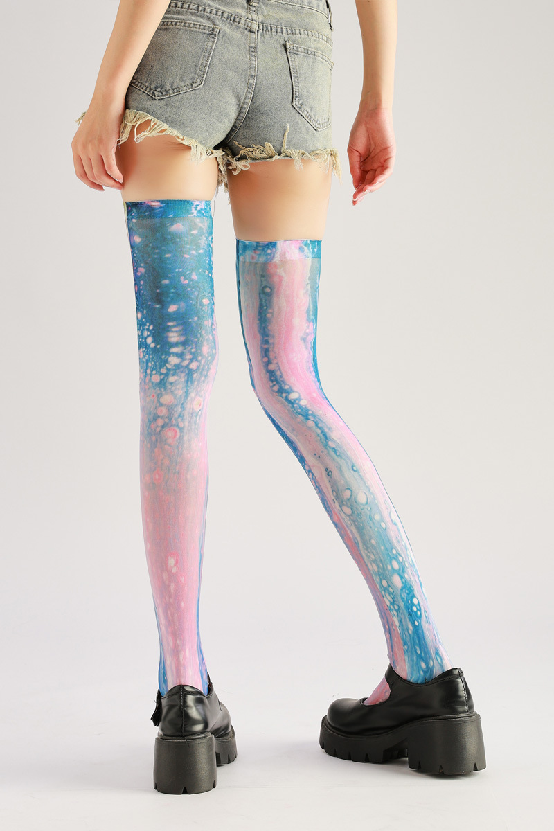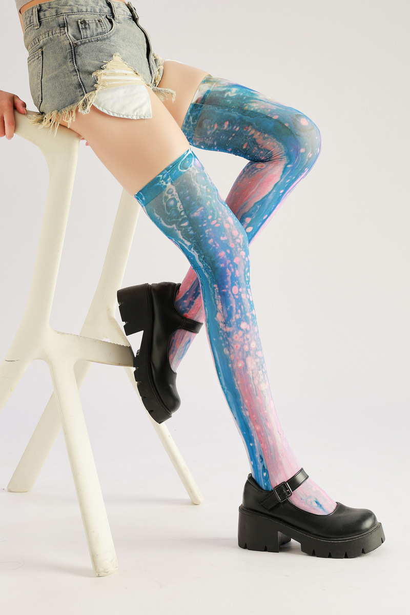 Blue and pink colorful pigment fantasy print high-tube socks, artistic colorful line pattern long socks, tight thigh-high socks, novelty socks for beauties, queen pantyhose, CD TS goddess stockings